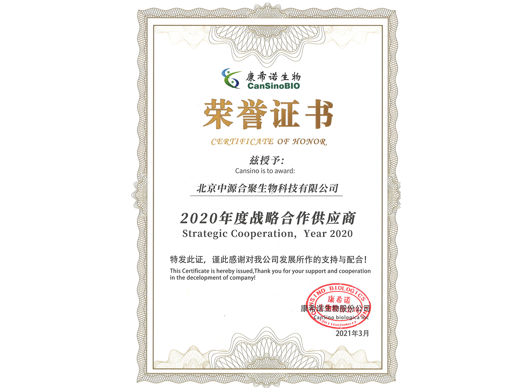 荣获康希诺生物“抗击新冠突出贡献供应商奖”