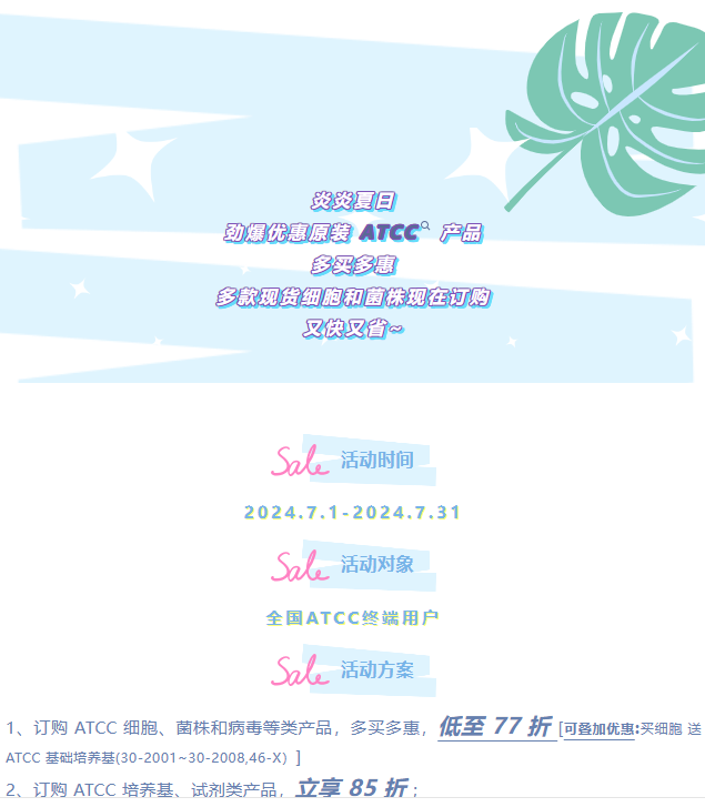 炎炎夏日 劲爆优惠原装 ATCC 产品 多买多惠 多款现货细胞和菌株现在订购 又快又省~2024-06-28 13:27:00.0