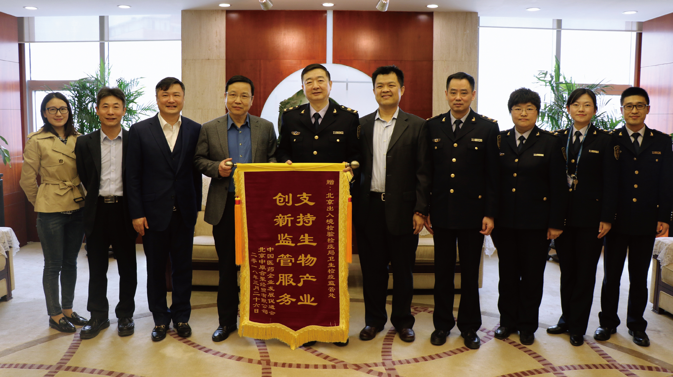 2018年3月28日,中国医药企业发展促进会副会长姚桐利和中原公司总裁朱晓勇、副总裁李志刚一起,向北京出入境检验检疫局卫生监督处赠送了锦旗2018-04-02 11:40:00.0