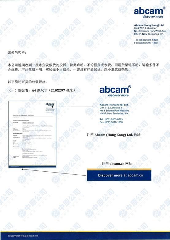 近期,Abcam公司收到一些水货及假货的投诉,这种产品,因进货渠道不明,运输条件不合规格,产品效用不明,从而导致一些实验做不出结果。在此,Abcam特此声明,这类产品一律没有产品保证,不退款或换货,请从正规渠道订购。