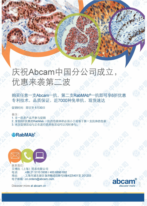 购买任意一支Abcam一抗,第二支RabMAb®一抗即可享6折优惠 专利技术,品质保证,近7000种兔单抗,现货速达 活动时间:即日起至6月31日 详情请联系:8441 5678 4008100881
