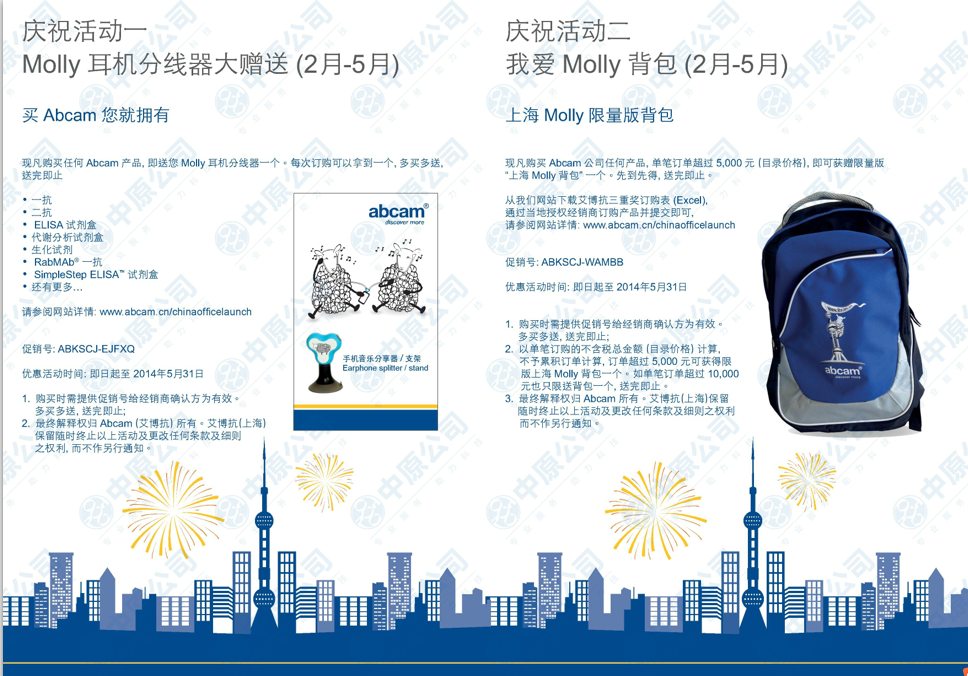 庆祝活动一:现凡购买Abcam公司任何产品,即送您“Molly耳机分线器”一个;