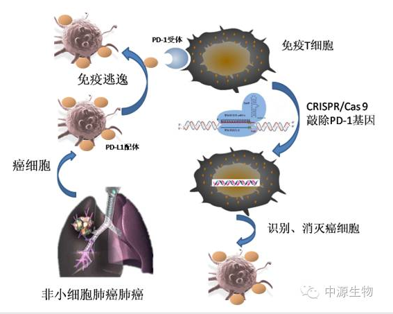 这项临床试验的招募对象是患有非小细胞肺癌,且癌症已经发生扩散,化疗、放疗及其他治疗手段均已无效的患者。在治疗癌症的研究中,将人体免疫T细胞分离出来,利用CRISPR/Cas9技术进行基因编辑,选择性地敲除PD-1基因,进而将T细胞潜在的对肿瘤细胞的攻击能力“激活”。在体外进行T细胞培养扩增后,再输回患者体内攻击肿瘤细胞,从而达到治疗目的。