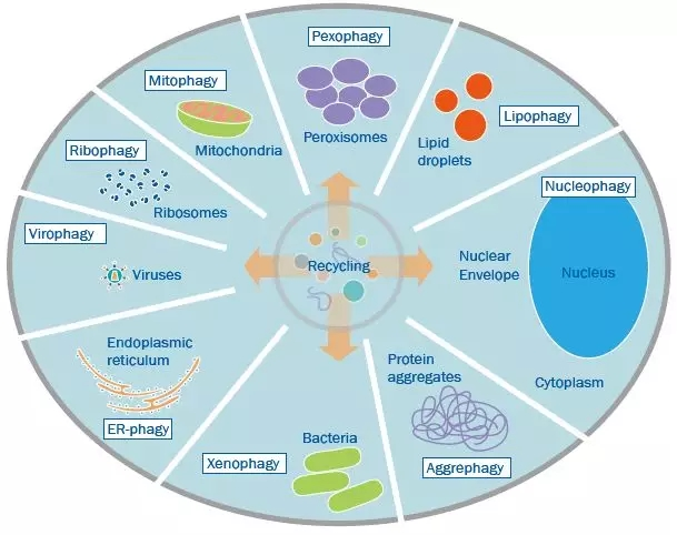 非泛素依赖性自噬:受体直接将各种分子和细胞器作为靶标,包括蛋白质、脂类、过氧化物酶体和溶酶体,以及许多其他细胞成分。