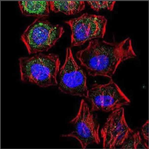 免疫细胞化学/免疫荧光:共聚焦分析Hela-细胞,使用的是LC3B抗体(产品编号 #NB600–1384, 1:5000)。采用Alexa Fluor 488-结合的山羊抗兔IgG作为二抗(绿色)。肌动蛋白被标记为Alexa Fluor 568 Phalloidin(红色)。DAPI用于染细胞核(蓝色)