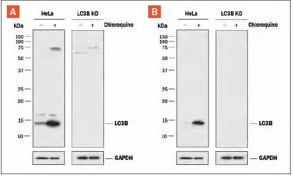 Hela人类宫颈上皮癌敏感细胞系和LC3B敲除的Hela细胞系,不处理或50μM氯喹处理18h。全细胞蛋白裂解物在1×Laemmli的样品缓冲液中溶解,以每个裂解物10μg上样至4-15%SDS- PAGE凝胶分离蛋白,转膜至0.2 μm 的PVDF膜,用含5%的脱脂奶粉的TBST封闭液来封闭。 PVDF膜用(A)兔抗LC3B多克隆抗体(产品编号#NB100-2220)和(B)兔抗LC3B单克隆抗体 (产品编号#NBP2-46892)作为一抗,二抗为HRP-标记的抗兔IgG。在亲本Hela细胞系中,特异的LC3B条带在约15kDa(如图所示),但在LC3B敲除的Hela细胞系中检测不到。GAPDH为内参蛋白。此实验条件被简化过。