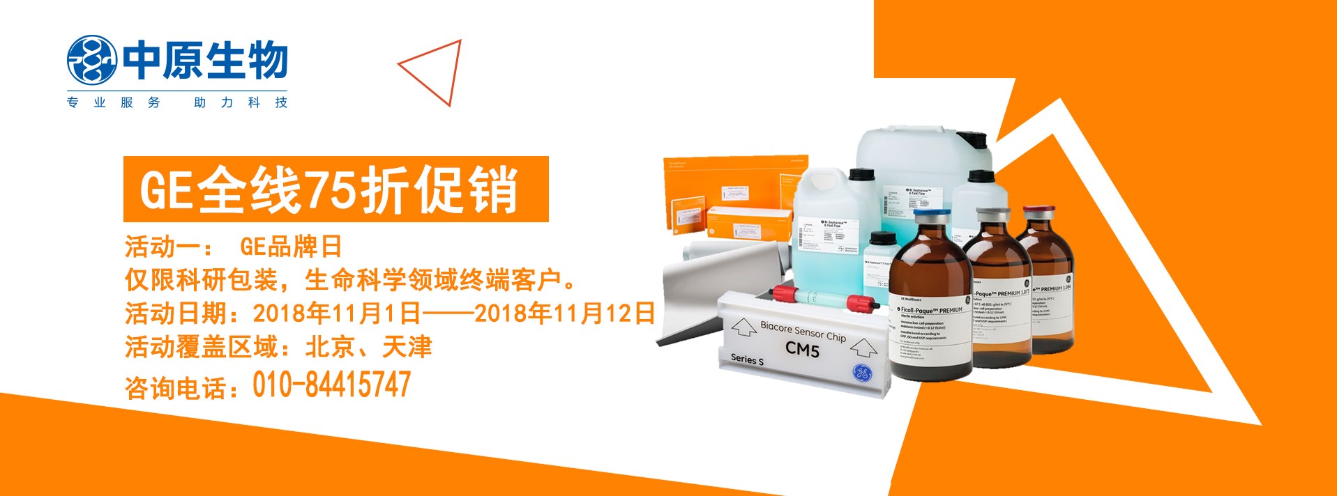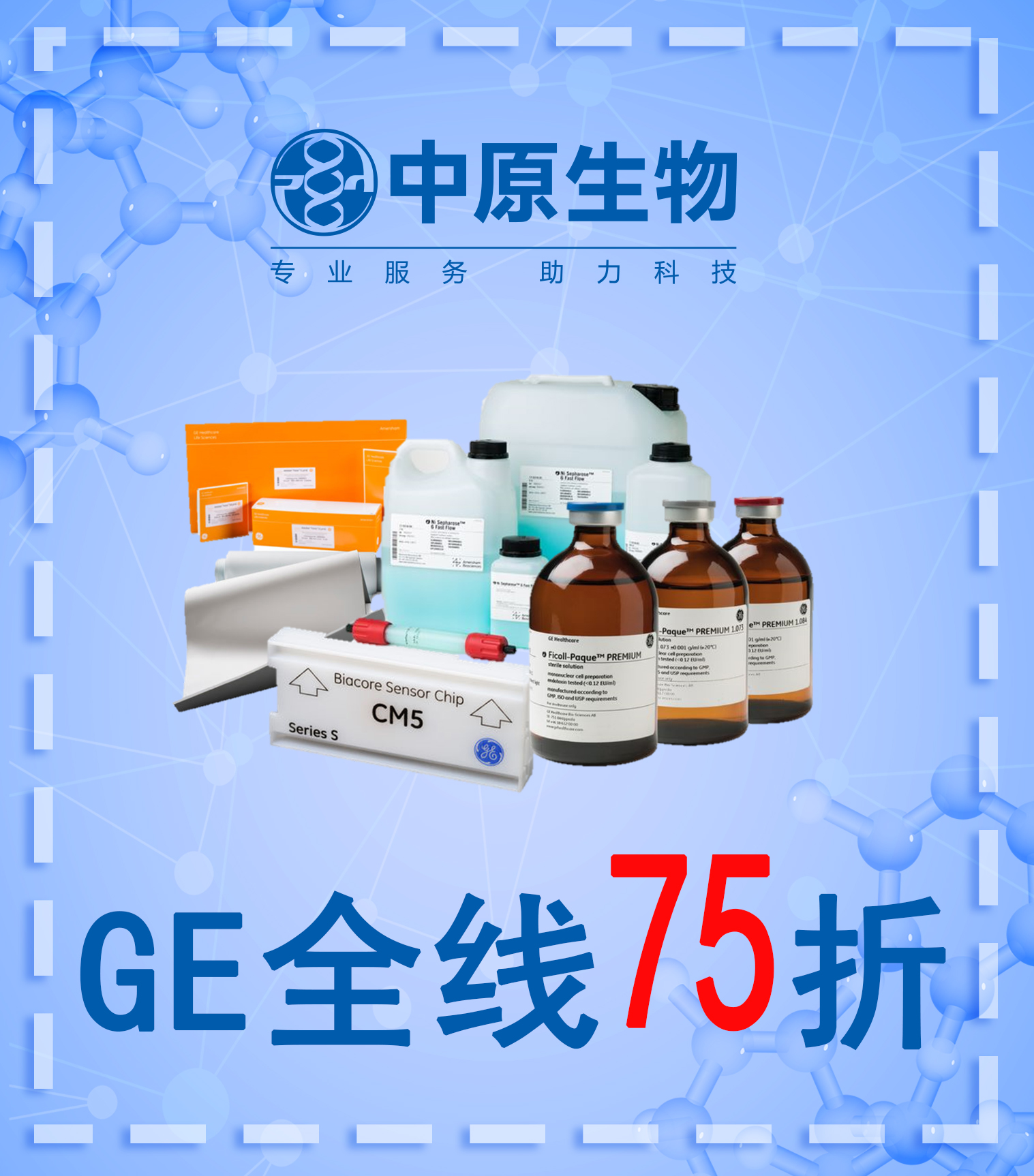 GE Healthcare的产品包括分子生物学试剂、电泳仪器、层析设备、层析介质、膜分离、分光光度计等,涵盖了从上游分子生物学到下游生物大分子分离纯化的全部过程。值此双十一之际,中原生物携手GE公司感恩回馈,全线75折,还有更多超低价产品等着您!