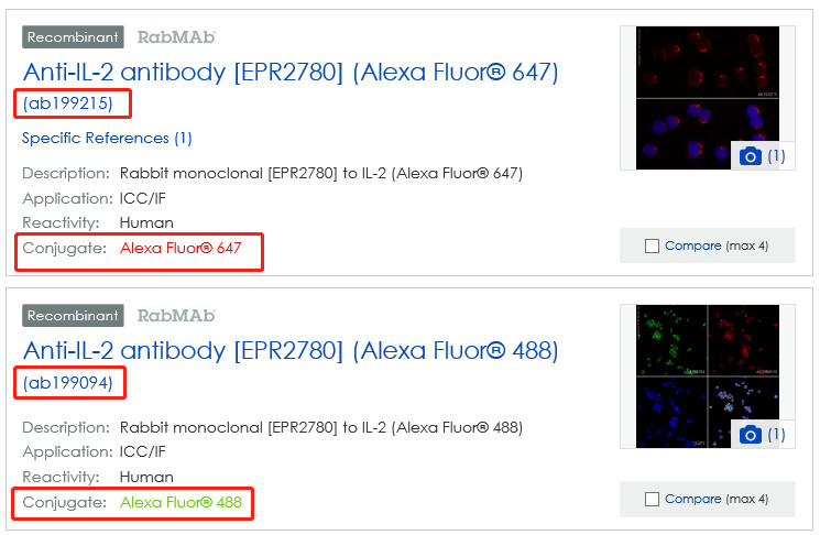 关于第2点,9U(中国)一站式服务平台举例进行说明。如下图所示,同一克隆号【EPR2780】的IL-2抗体偶联了不同的荧光素(AF647和AF488),其抗体货号不同,是2个不同的产品。