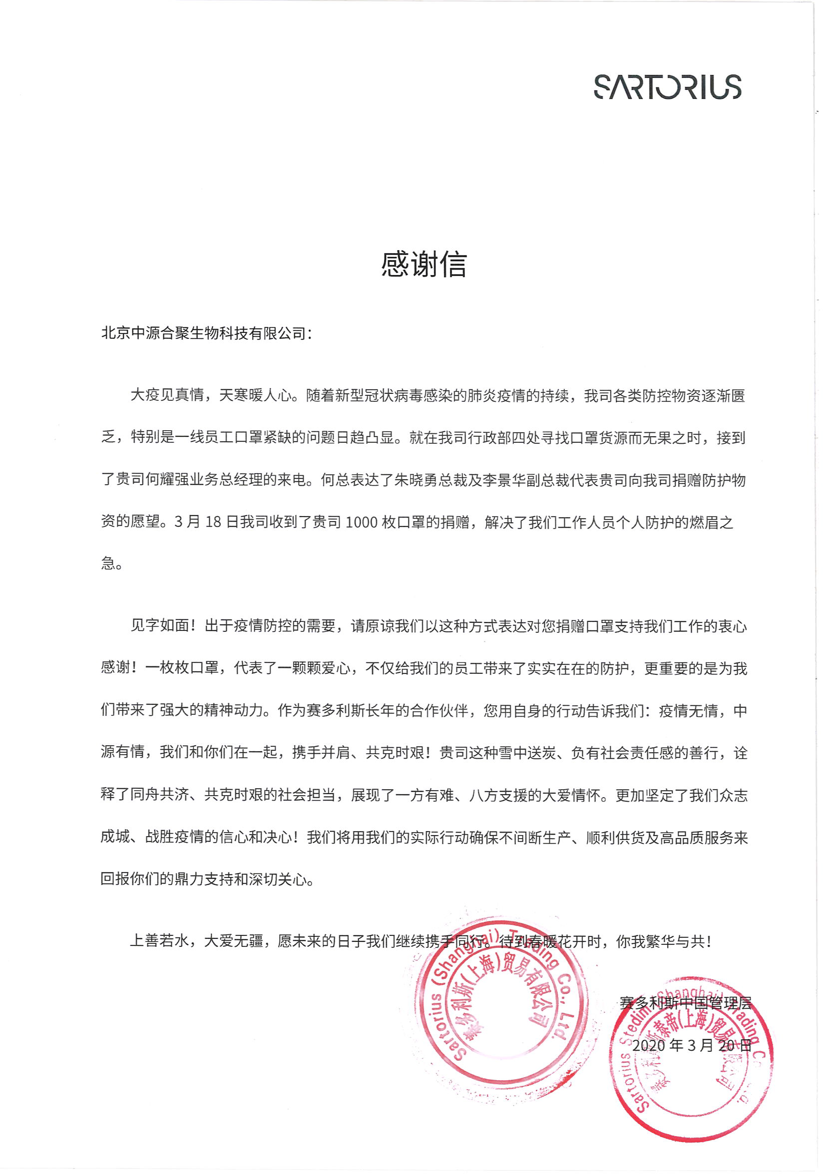 3月18日,正当防疫物资紧缺之际,1000枚口罩送至了赛多利斯的手中。一枚枚来自中源的口罩,不仅是出于多年合作,更是体现了中源同舟共济,大爱之心。