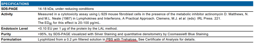 答案就在说明书 Formulation 那一栏里,9U(中国)一站式服务平台在蛋白中添加了海藻糖。海藻糖是一种以两个葡萄糖分子通过 α,α,1,1-糖苷键连接的二糖。海藻糖是一种非还原糖,不与氨基酸或蛋白质发生反应。