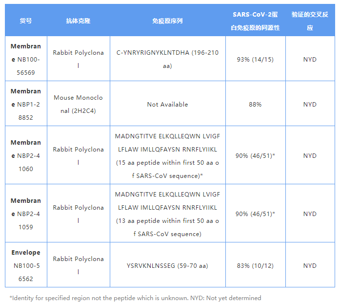 SARS-CoV-2 与 SARS-CoV 的膜蛋白具有 91% 的序列同源性,包膜蛋白具有 95% 的序列同源性。Novus Biologicals® 提供了几种用于检测 SARS-CoV 内膜蛋白和包膜蛋白的抗体,这些抗体可用于 WB、ICC / IF、ELISA 等多种应用。