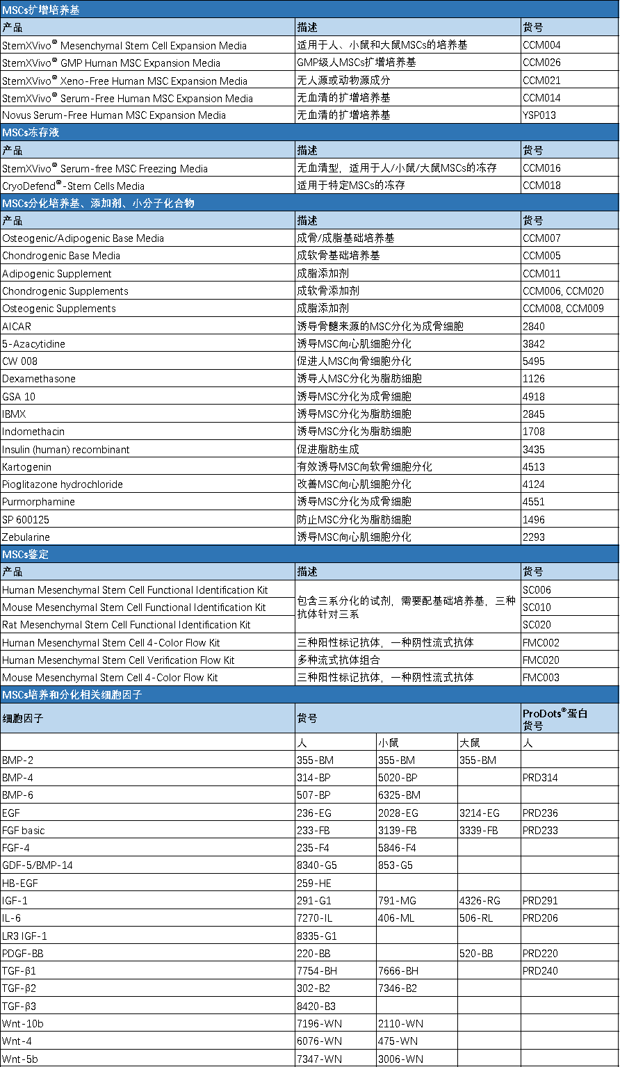Bio-Techne 可提供 BM-MSCs 及 HSCs 分离、鉴定、培养、诱导分化的全套解决方案,以 MSCs 的研究为例:
