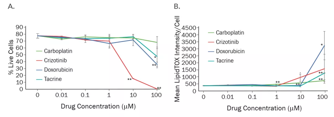 图 3 使用 StemXVivo Hepatocyte Differentiation Kit 将 iPSK3 人诱导多能干细胞再分化为肝细胞样细胞,并将细胞接种于 96 孔板中,使用肝毒性化合物(Carboplatin、Doxorubicin、Crizotinib、Tacrine)进行筛选。细胞活力(A)和脂质代谢(B)分析表明,肝毒性化合物对 iPSCs 衍生的肝细胞的毒性具有剂量依赖性。