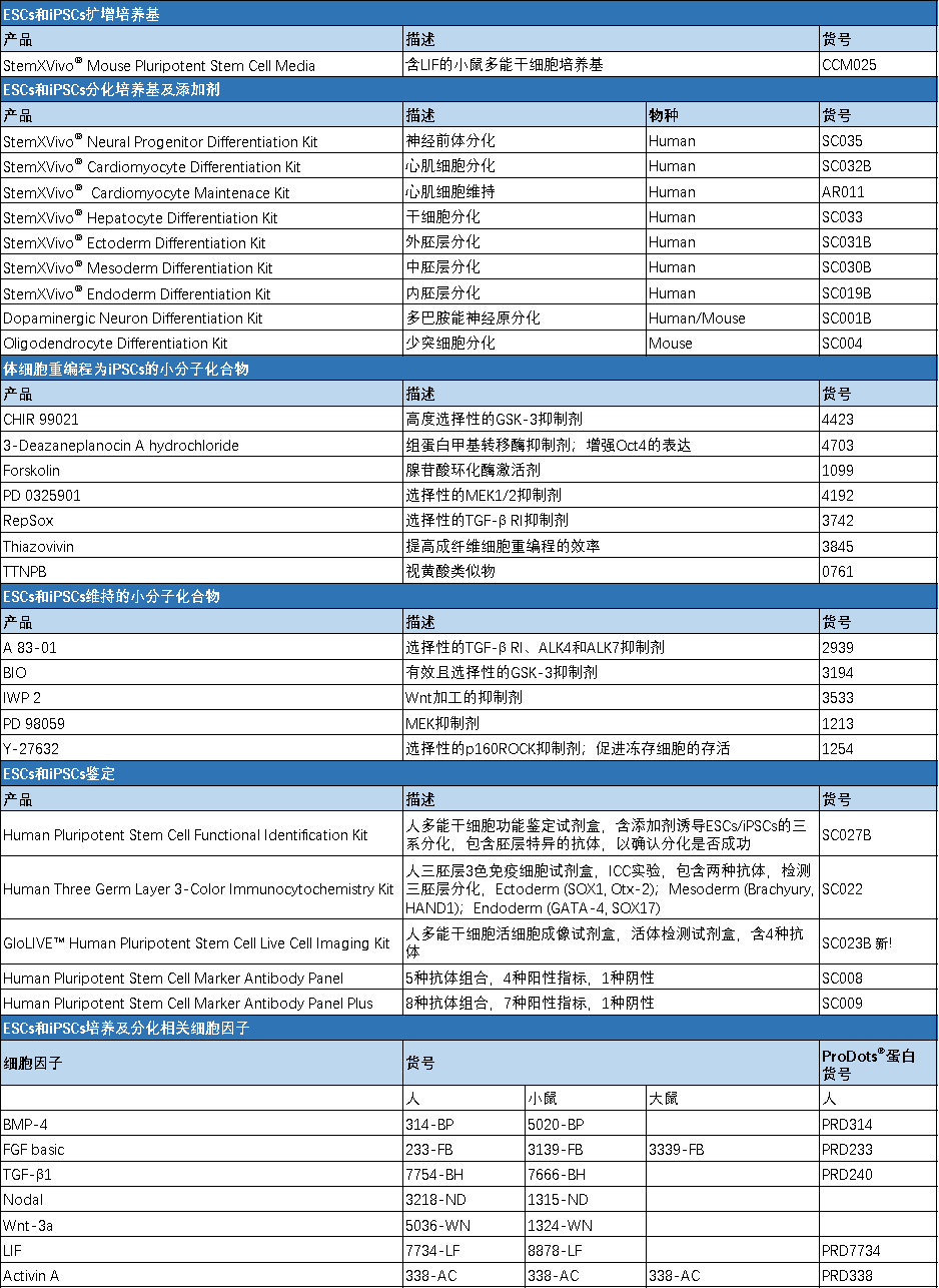 多能干细胞的鉴定与研究包括培养、分化、验证等环节,Bio-Techne 可提供相关的培养基、试剂盒、细胞因子及小分子化合物: