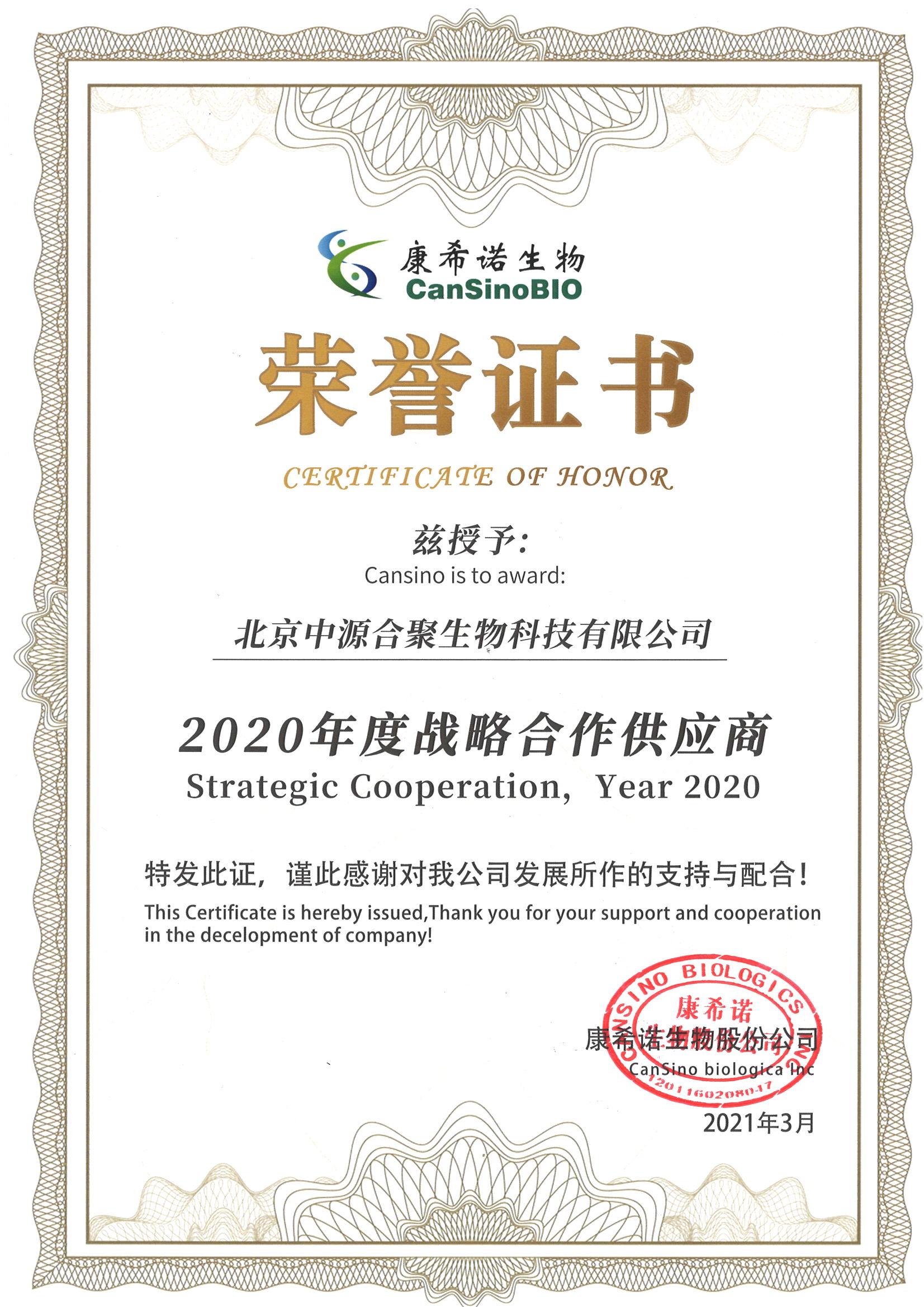 康希诺生物“2020年度战略合作供应商”