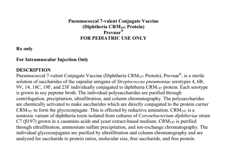 2000年,在没有合适的青少年疫苗的近20年后,美国惠氏(后被辉瑞收购)开发出一种7价肺炎结合疫苗(PCV7,Prevnar;惠氏),并在美国被授权用于婴幼儿。这种疫苗是通过蛋白载体与血清型4,6B,9V,14,18C,19F和23F的纯化多糖共价偶联产生的。
