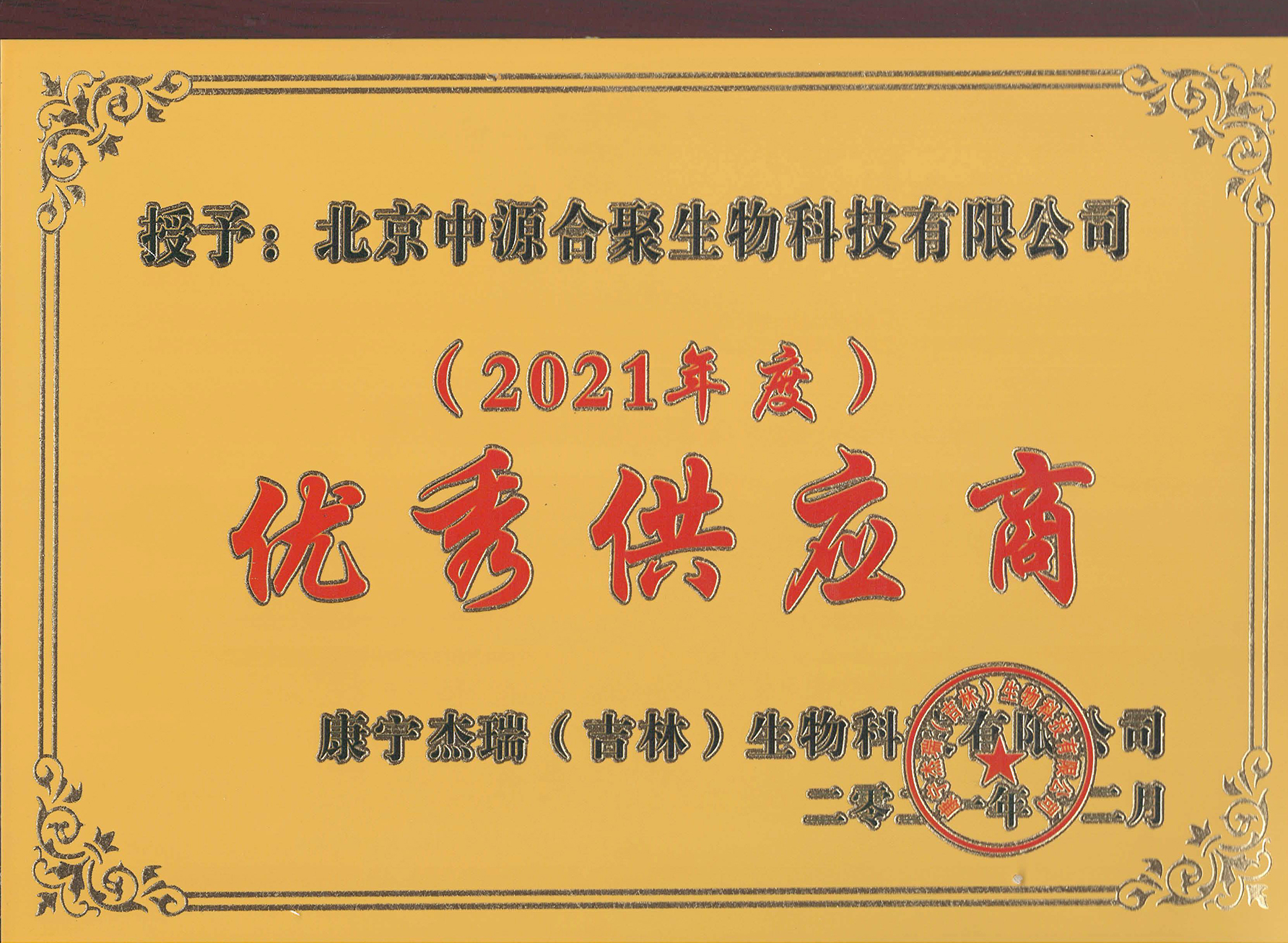 康宁杰瑞(吉林)生物“2021年度优秀供应商”