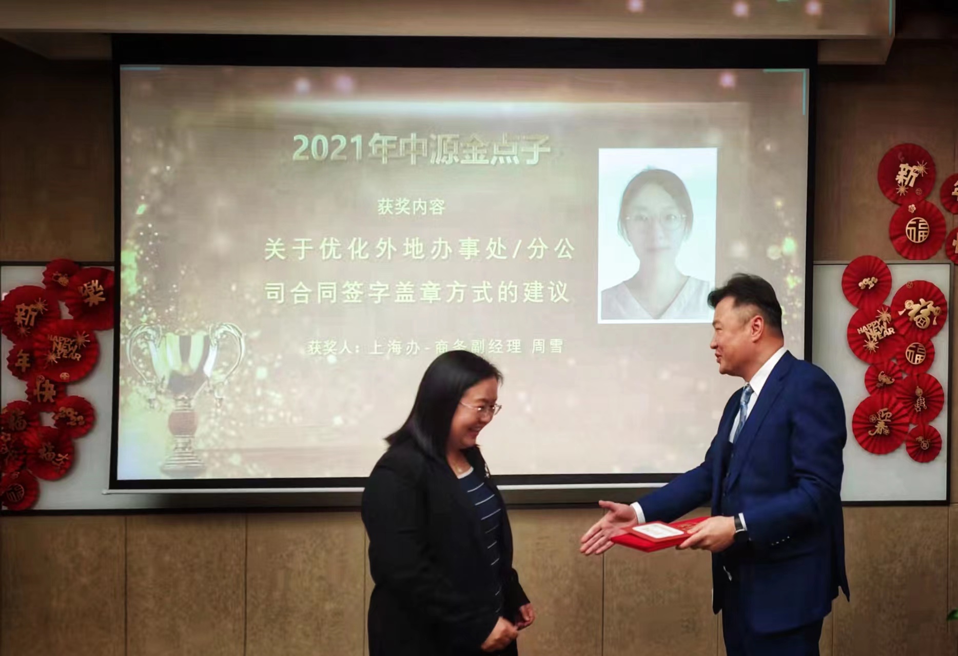 中源公司一直以来都非常重视来自于基层的声音,每一步发展都离不开员工们的思想涌动和创新思维。为鼓励每一位中源人积极地参与到公司发展建设中去,特设立“金点子奖项”。2021年度“金点子奖项”得主为上海办商务副经理周雪。