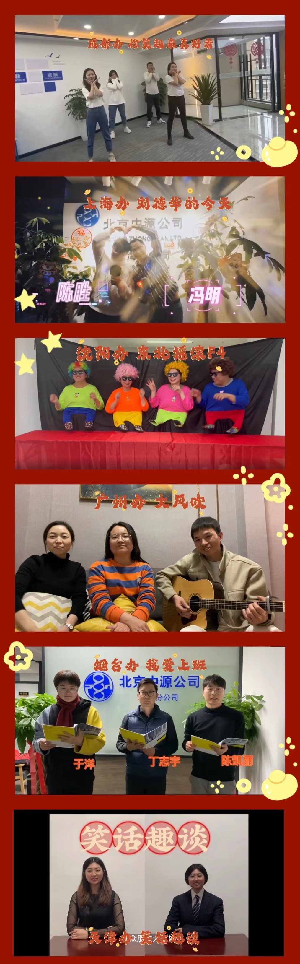 总结大会结束后,继续进行了中源线上云春晚的环节,今年的云春晚邀请各外地办提前录制节目,并在联欢会现场播出,成都分总司录制四人歌舞《你笑起来真好看》,上海分总司贡献歌曲翻唱《刘德华的今天》,沈阳分公司由8人录制《东北摇滚F4》,广州分公司3人自弹自唱粤语歌曲《大风吹》,烟台分公司录制特别诗朗诵《我爱上班》,天津分公司自制欢乐小品《笑话趣谈》,最终沈阳办以幽默搞笑的歌曲节目《东北摇滚F4》成功夺得最受欢迎节目奖。