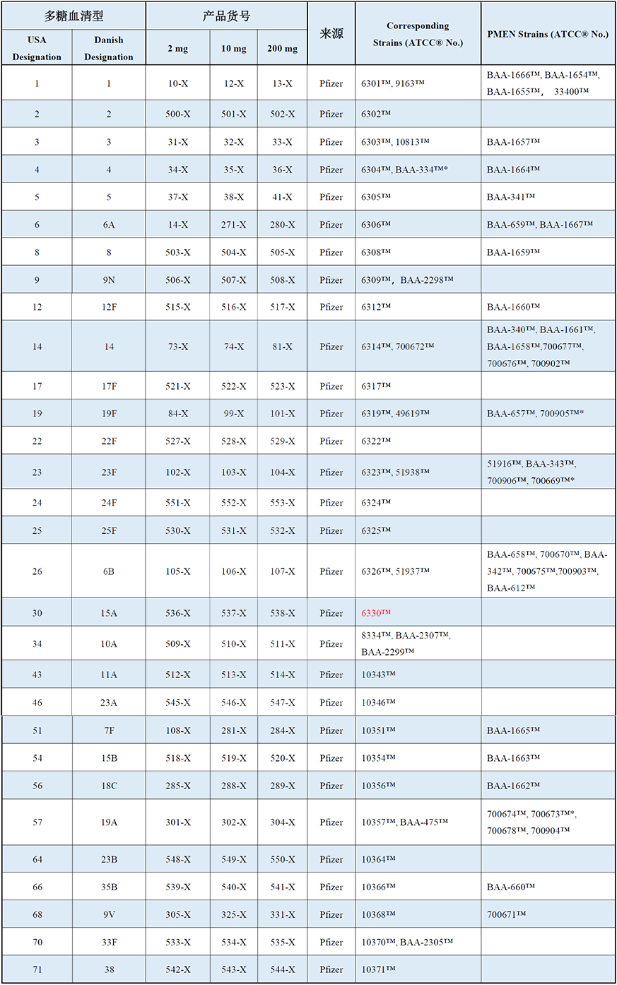 为了帮助研究肺炎链球菌相关疾病,ATCC可提供肺炎链球菌多糖。ATCC从Pfizer公司获得肺炎链球菌多糖(这些产品由Pfizer公司生产,抗原性也分别由其验证)。和它们与目前市面上可买到的疫苗的血清型相同。每种多糖产品是被分别提取和纯化的,因此可作为特异性且有效的抗原用于以下研究: