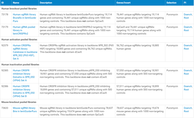 以下是目前可以提供的CRISPR libraries研究相关慢病毒对应的质粒,点击“Name”列即可进入质粒对应的慢病毒产品页面,从而可以查询慢病毒产品的价格、体积、滴度、运输形式、储存温度等信息。