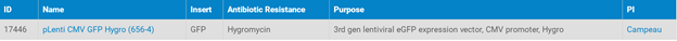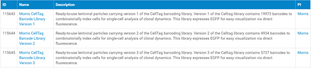 以下是目前可以提供的Barcoding Libraries研究相关慢病毒对应的质粒,点击“Name”列即可进入质粒对应的慢病毒产品页面,从而可以查询慢病毒产品的价格、体积、滴度、运输形式、储存温度等信息。