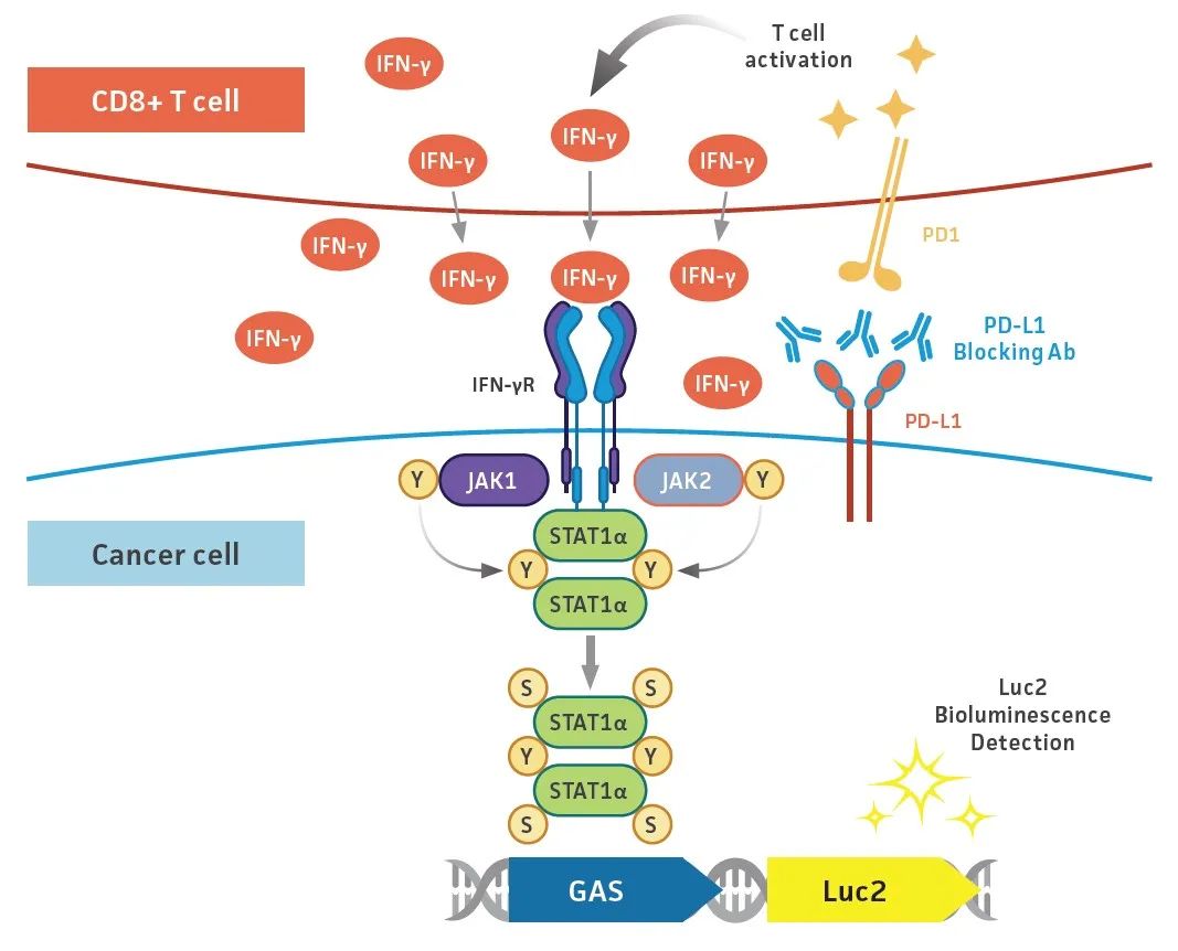 最近的研究表明,在体外和体内,干扰素γ受体(IFN-γR) JAK-STAT信号通路在实体肿瘤中是T细胞杀死癌细胞所必需的,而在液体肿瘤中非必须。同时,荧光素酶基因上游含有一个γ干扰素激活位点(GAS) 应答元件的细胞信号报告系统(如萤火虫荧光素酶;Luc2)被广泛用于检测细胞间IFN-γ信号。