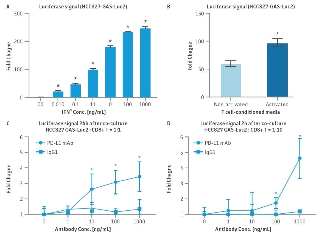 图 2: HCC827-GAS-Luc2细胞系评估。用不同的刺激剂评估HCC827-GAS-Luc2细胞信号激活后荧光素酶表达量:(A)IFN-γ刺激(0.01-1000 ng/mL),(B) 来着未激活和激活的原代CD8+毒性T细胞的条件性检查点培养基,(C, D)在PD-L1阻断抗体或同型对照IgG1(1-1000 ng/mL)的存在下与原代人CD8+毒性T细胞共培养。所有实验中N=3., P<0.05。