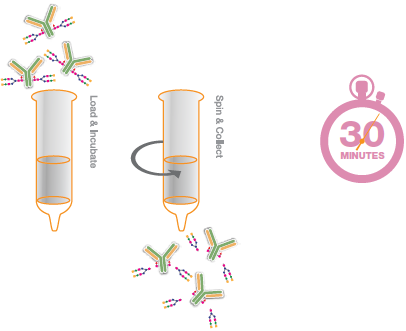 deGlycIT是固定在琼脂糖上的IgGZERO,可以快速和选择性去除Fc上的N-聚糖。提供的离心柱预先填充有固定化IgGZERO,可用于少量甚至高达数百mg抗体的去糖基化。