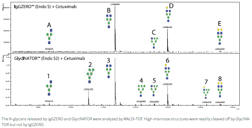 GlycINATOR 可以去除人IgG 上的所有高甘露糖型聚糖,但是IgGZERO不能。两种酶均可除去复杂型聚糖,而GlycINATOR 对杂合型聚糖更有效。