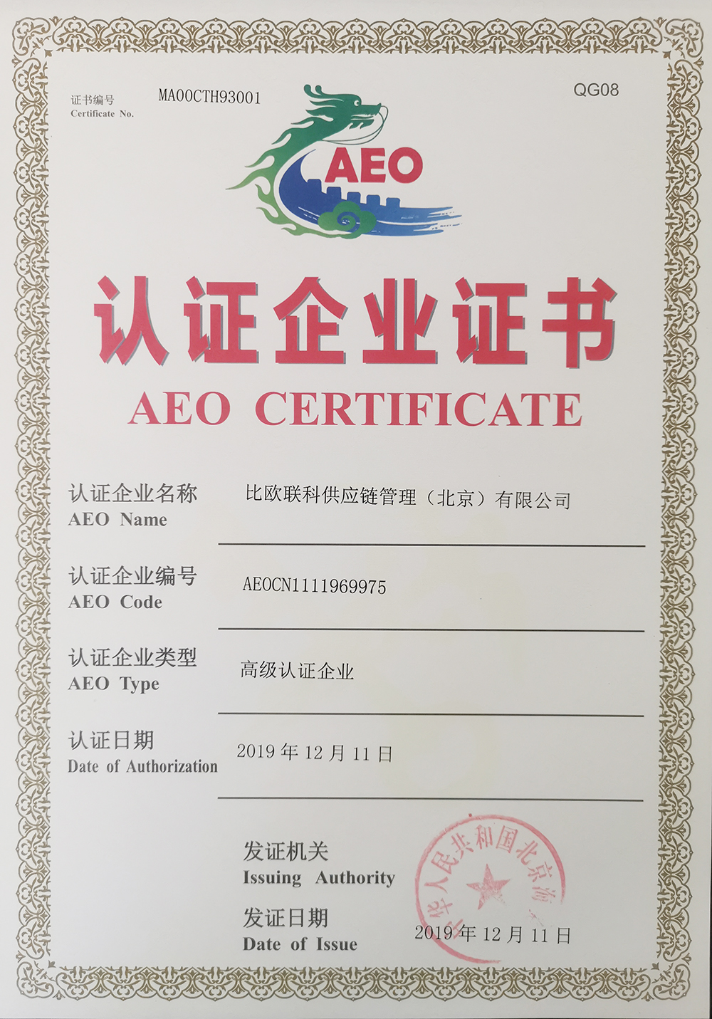 AEO (Authorized Economic Operator),means “authorized operators”, according to “Measures of the People's Republic of China for Customs Enterprise Credit Management” 2018,“Authorized enterprise” means the authorized operators by Chinese Customs (AEO). Chinese Customs recognized with other nation or area customs and provide more convenient customs clearance process. AEO senior authorized is the highest credit level issued by Chinese Customs, is the symbol of the top level international trade enterprise, inspection content involved enterprise internal management, current operating situation, legalization, trade safety and other 27standards.