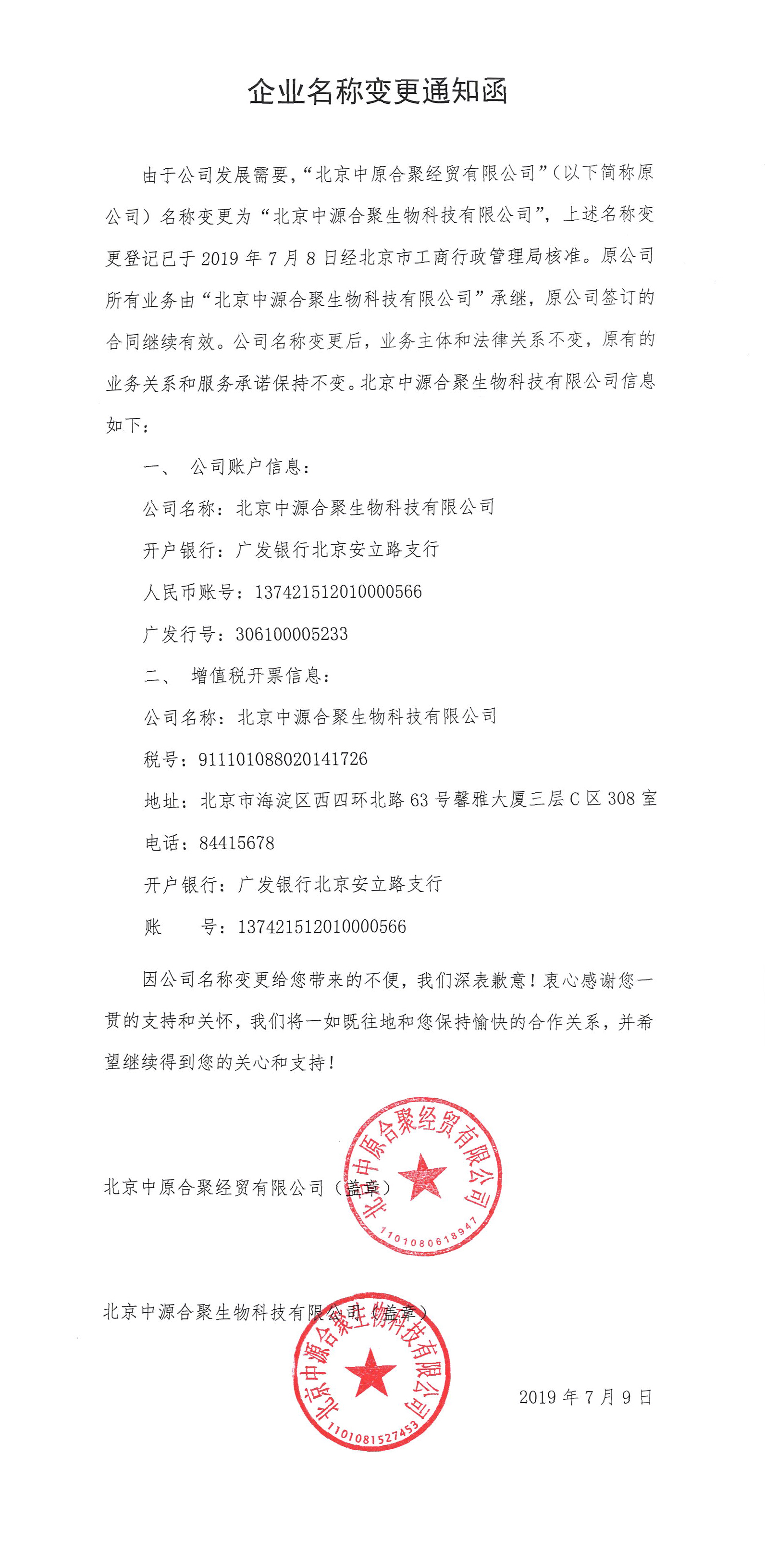 企业名称变更通知函